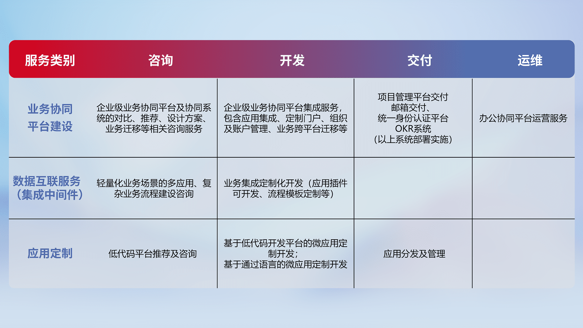 针对钉钉、、、、企微、、、、IDaas等平台级产品提供产品的规划、、、方案、、、交付、、定制化开发等服务,,,实现如统一协同办公、、、、智能客户服务、、混合会议管理、、智能数据查询、、等业务场景,,,实现数字化转型。。